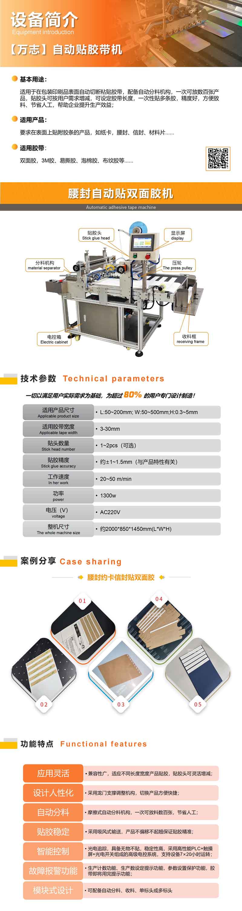 適用(yòng)於在包裝印刷品表麵自動(dòng)切斷(duàn)粘貼膠(jiāo)帶,配置備自(zì)動分料(liào)機構,一(yī)次可放數百張產品(pǐn),貼膠頭可按用戶需求增減,可設定膠帶長度,一次性貼多(duō)條膠,精度好,方便放料、節省人工,幫(bāng)助(zhù)企業提升(shēng)生產 益;